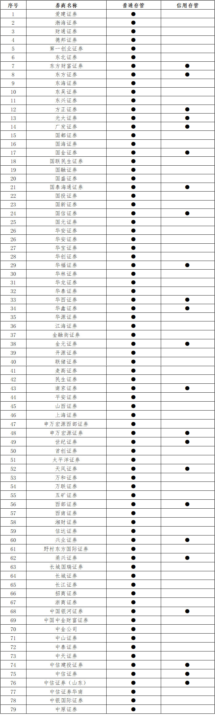 截至目前,我行三方存管業(yè)務(wù)的合作證券公司共79家,其中同時(shí)合作普通存管和信用存管的共23家。具體名單如下(按拼音排序,排名不分先后):